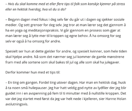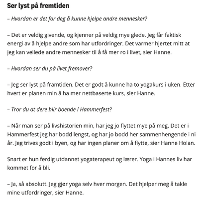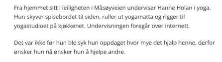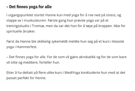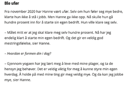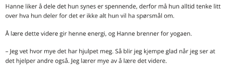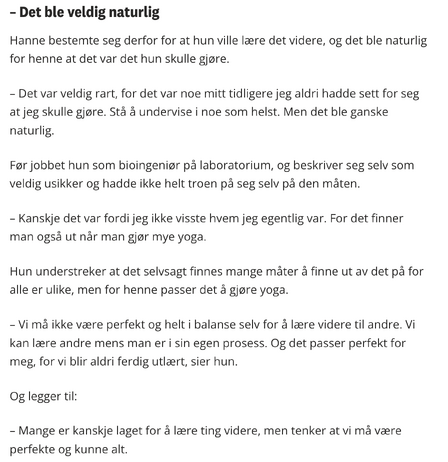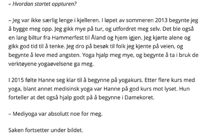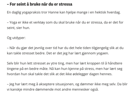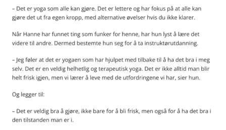 Høsten 2023 ble jeg kontaktet av journalist som hadde lyst å skrive om min historie med yoga, det synes jeg var veldig gøy og hyggelig. Godt å spre litt av det også innimellom alt det tragiske og fryktspredningen i nyhetsbildet. Tusen takk Cecile Ditløvsen🩷
